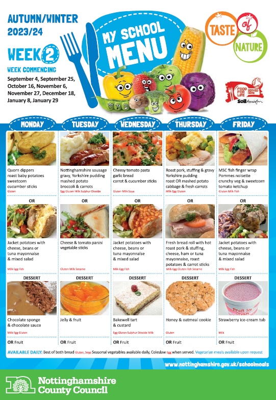 Our catering team provide delicious cooked lunches. The meals are nutritional, very well cooked and presented, offer excellent value for money and are prepared from fresh produce everyday. Please contact us, or find out more from Nottinghamshire County Council.