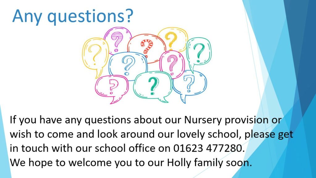At Holly Primary School we believe that all children deserve an education rich in wonder and memorable experiences that allows children’s natural creativity and curiosity to flourish, alongside the purposeful acquisition of skills and knowledge. We believe that an education that does all of this gives children the best chance to become well-rounded, happy individuals, ready to succeed in an ever-changing world. Please view our welcome presentations, and details of Nursery Provision Options. Please also note that In September of the academic year that children have their fifth birthday, they begin ‘F2’. These children form our Reception Class and attend school full time.