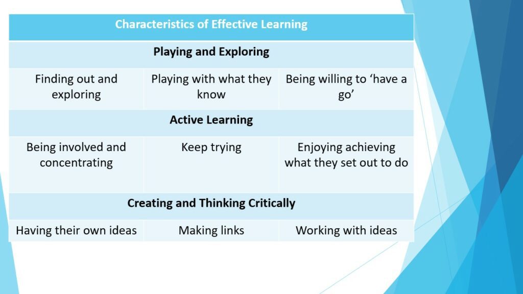 Our practice is underpinned by the ‘Characteristics of Effective Learning’ in order to help children reach their potential and develop the skills required to engage in learning.